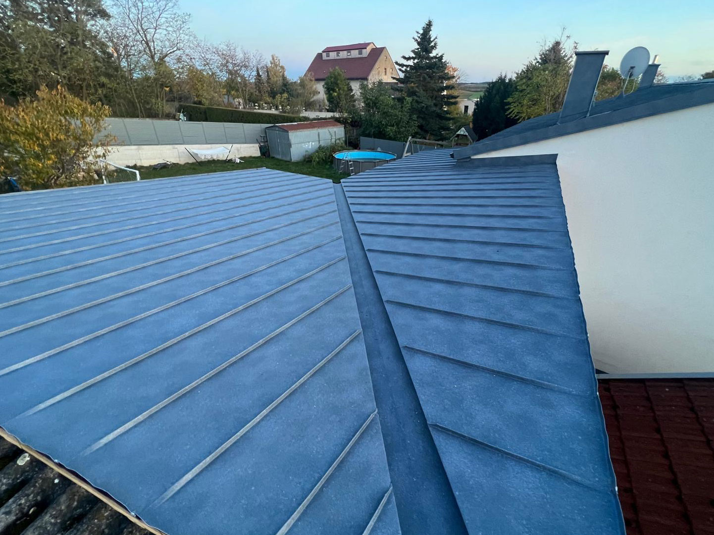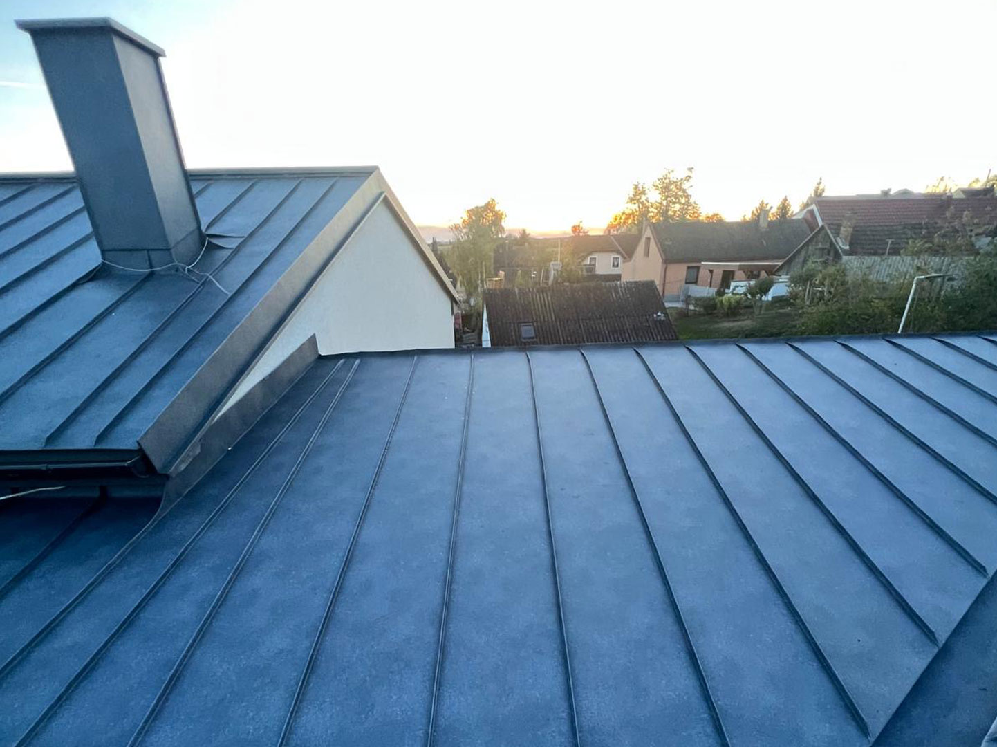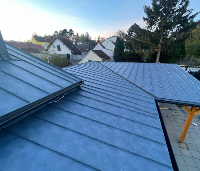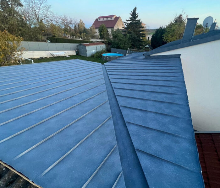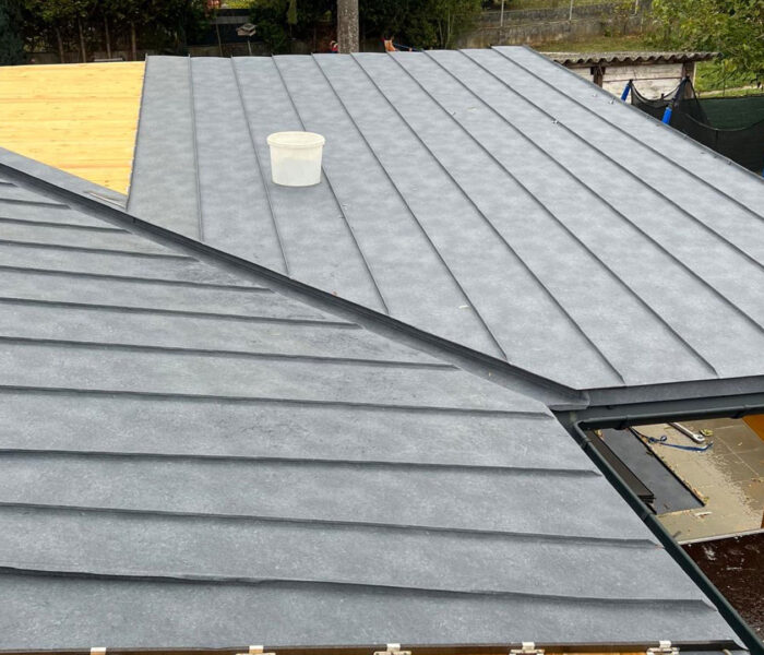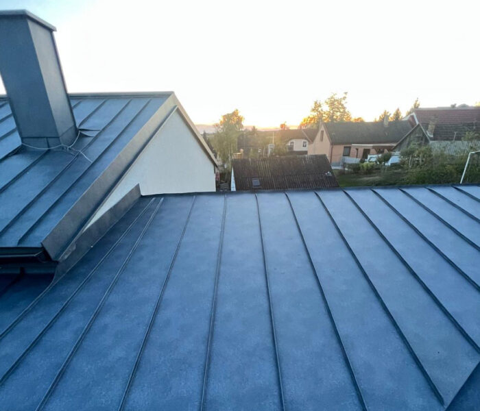 Für die notwendige Hinterlüftung und eine sichere Befestigung der Eindeckung wurden die entsprechenden Lattungen fachgerecht montiert. Die abschließende Deckung wurde im Stehfalzsystem ausgeführt und überzeugt durch ihre klare Optik sowie ihre hohe Widerstandsfähigkeit gegenüber Witterungseinflüssen.