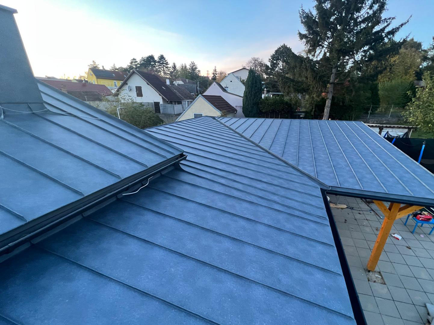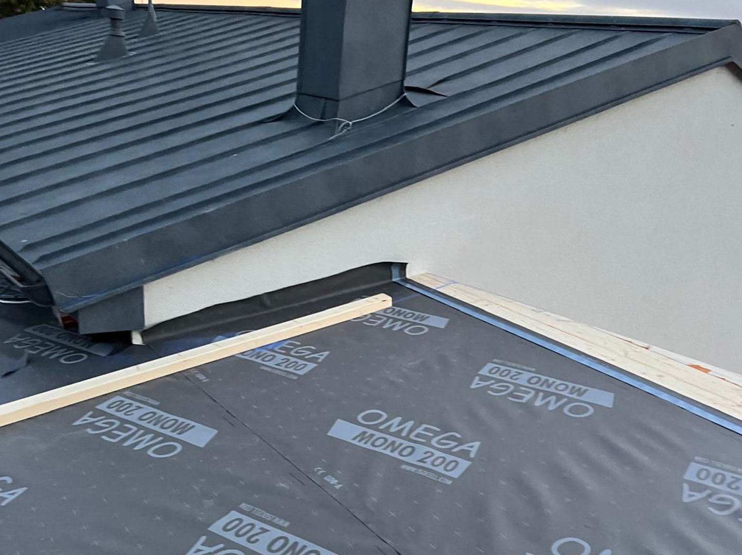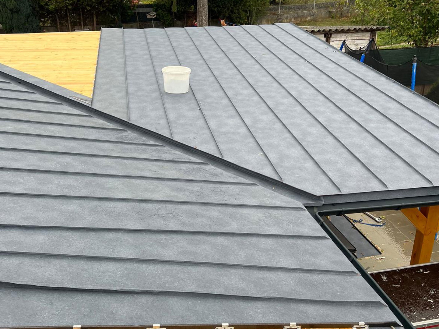 Für die notwendige Hinterlüftung und eine sichere Befestigung der Eindeckung wurden die entsprechenden Lattungen fachgerecht montiert. Die abschließende Deckung wurde im Stehfalzsystem ausgeführt und überzeugt durch ihre klare Optik sowie ihre hohe Widerstandsfähigkeit gegenüber Witterungseinflüssen.
