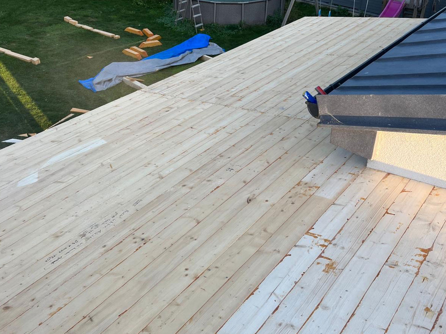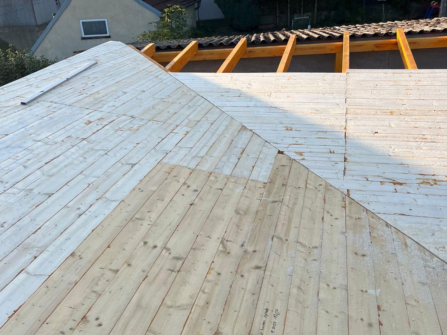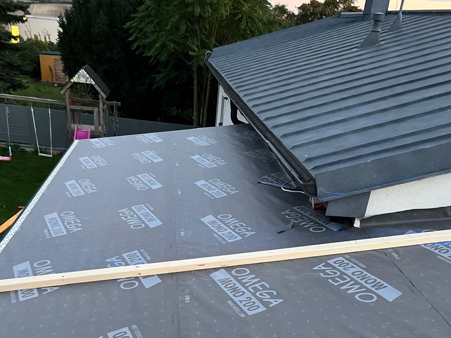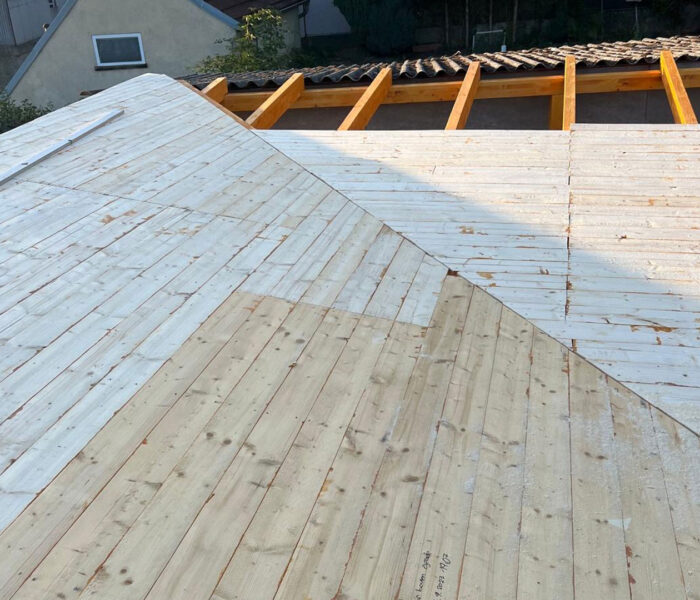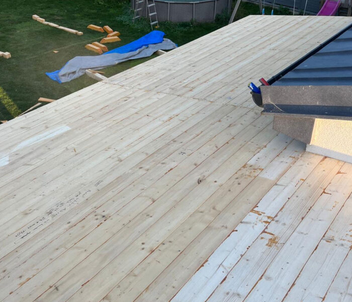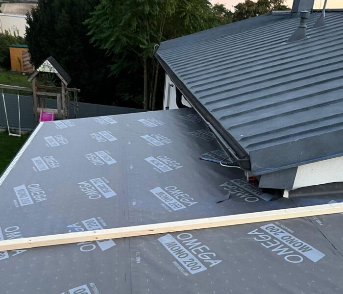 Bei diesem Projekt erfolgte eine vollständige Erneuerung der Dachfläche mit einer modernen Metall Stehfalzdeckung. Als Grundlage wurde zunächst eine neue Holzschalung hergestellt, die eine stabile und dauerhafte Basis für den weiteren Aufbau bildet. Zum Schutz der Konstruktion vor Feuchtigkeit kam anschließend eine diffusionsoffene Unterdachbahn zum Einsatz, die zusätzlich zur Langlebigkeit des Daches beiträgt.