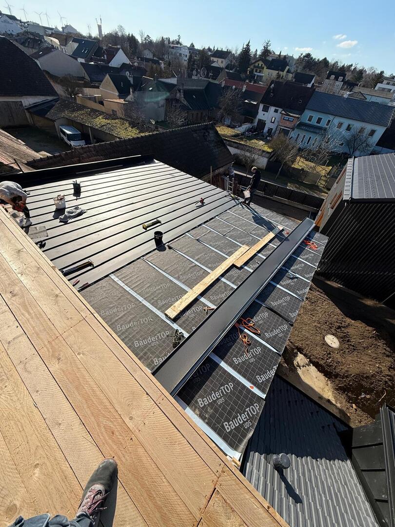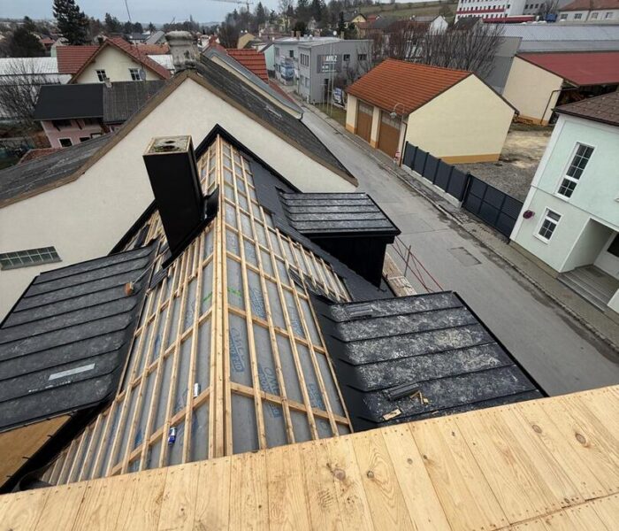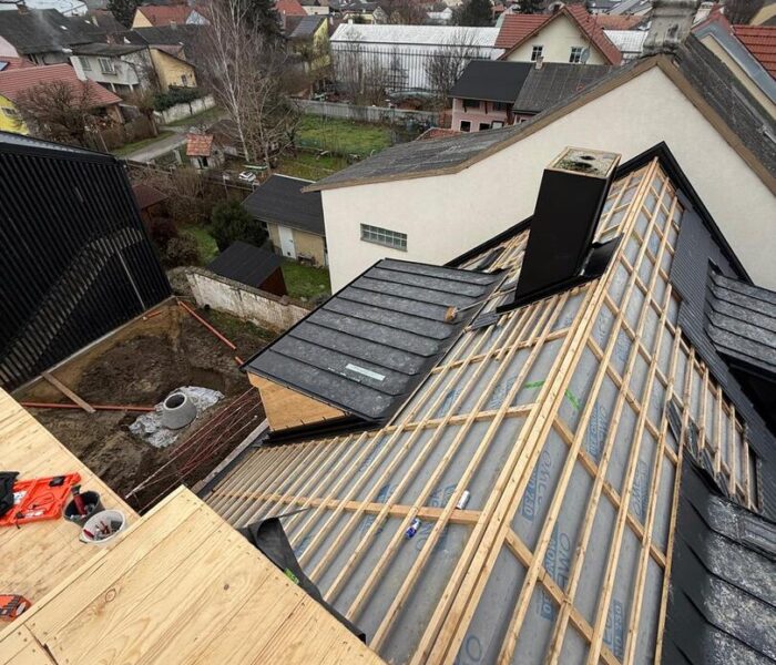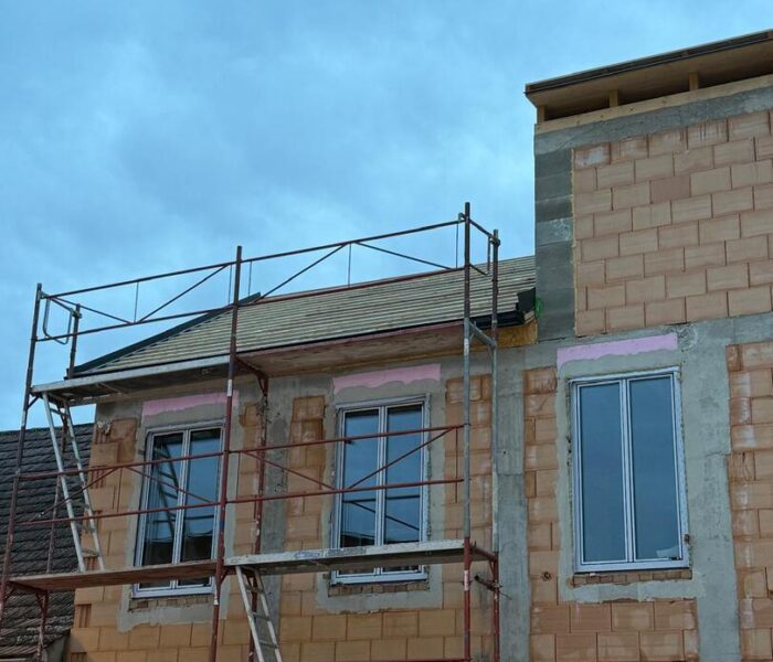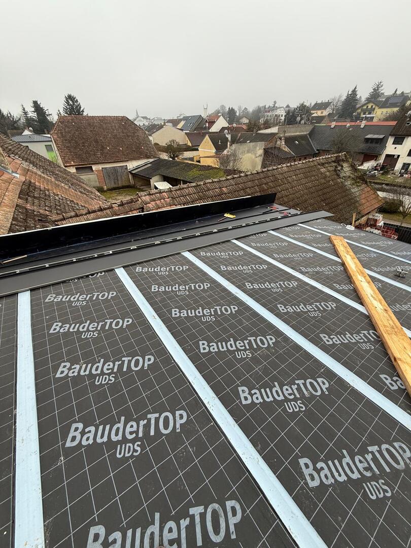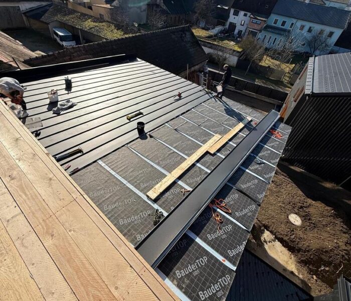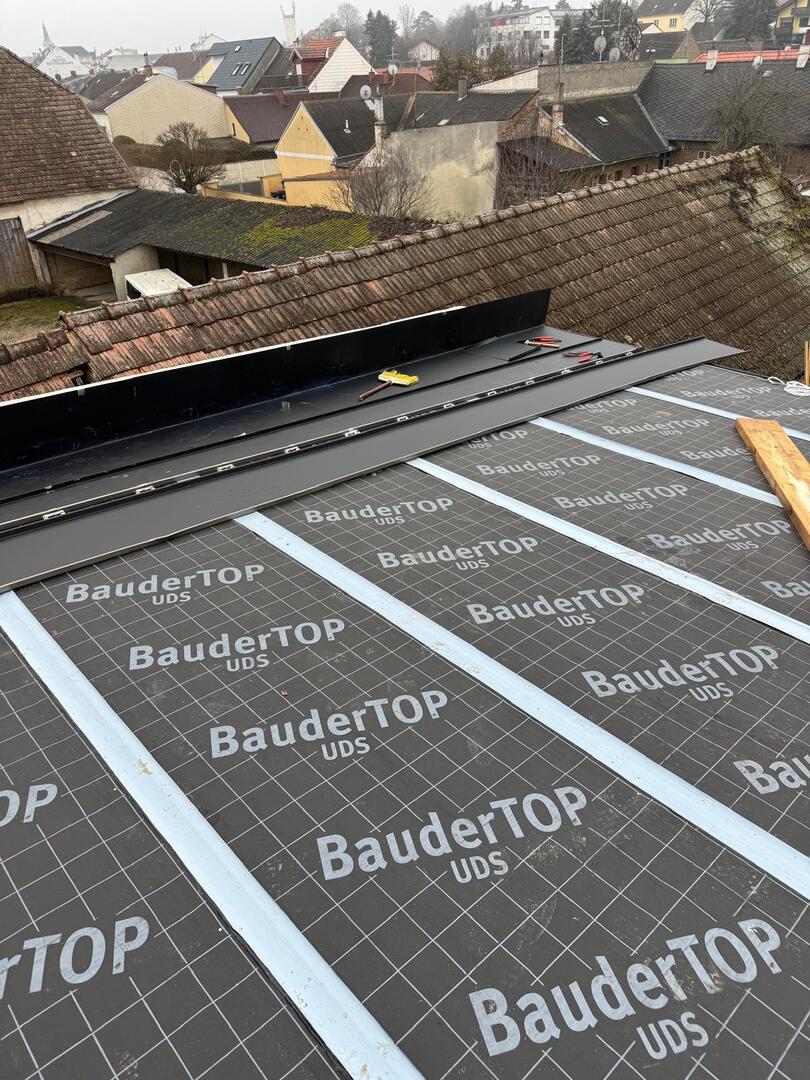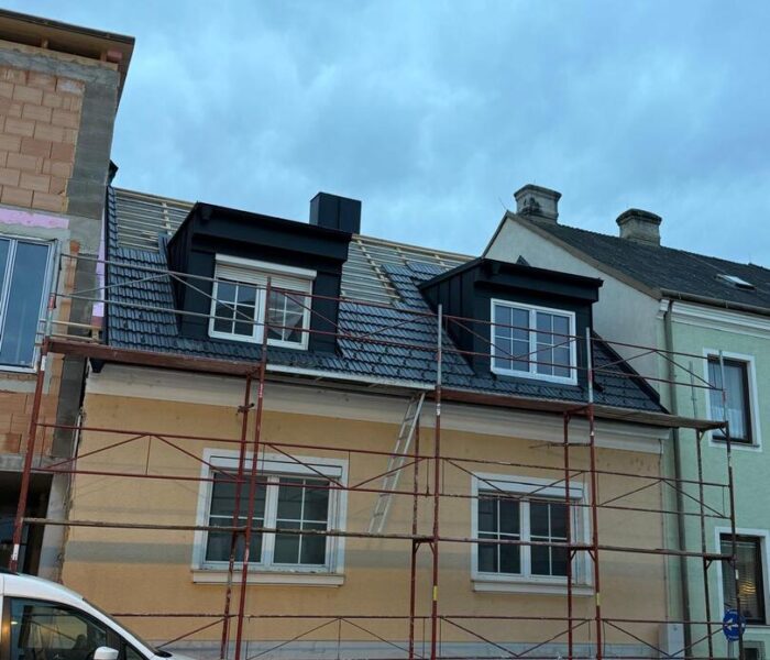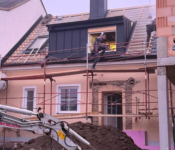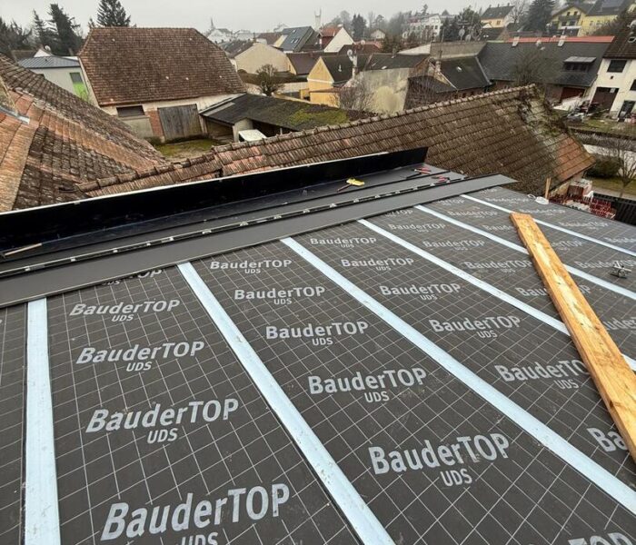Bei diesem Projekt wurde das Obergeschoss eines Wohnhauses modernisiert und das Dach komplett neu gedeckt. Zunächst entstand der Rohbau in Ziegelbauweise, danach wurden Dachgauben montiert, um mehr Licht und Raum zu schaffen. Anschließend erfolgte die Eindeckung mit hochwertigen Metallplatten, unterstützt durch eine stabile Holzunterkonstruktion und Abdichtung mit BauderTOP-Schutzfolie.