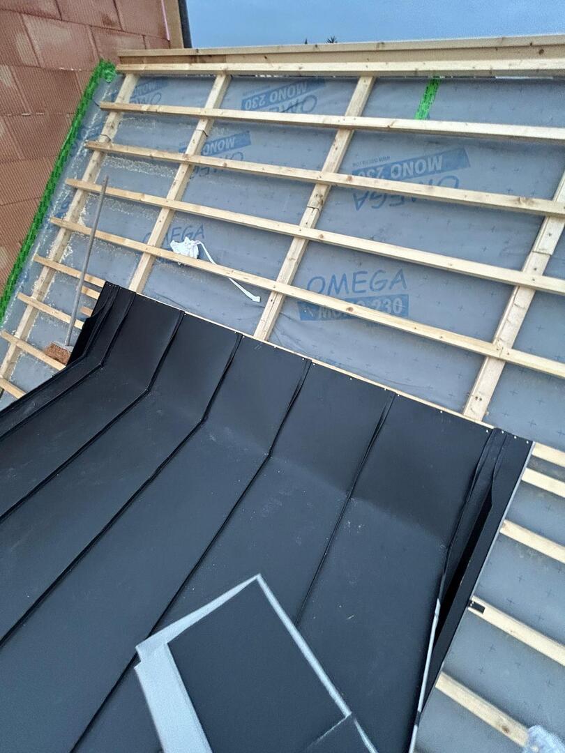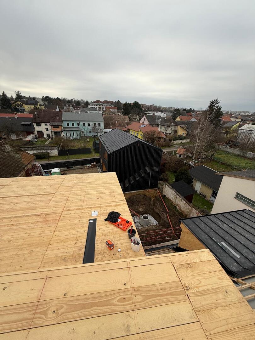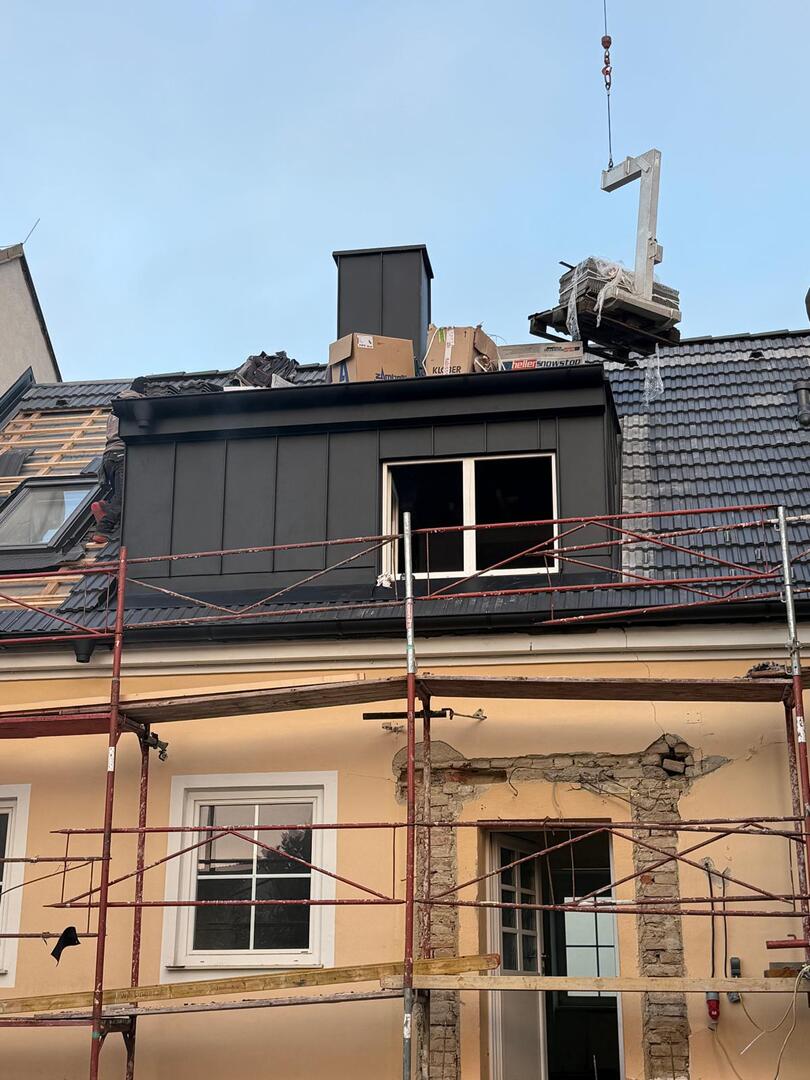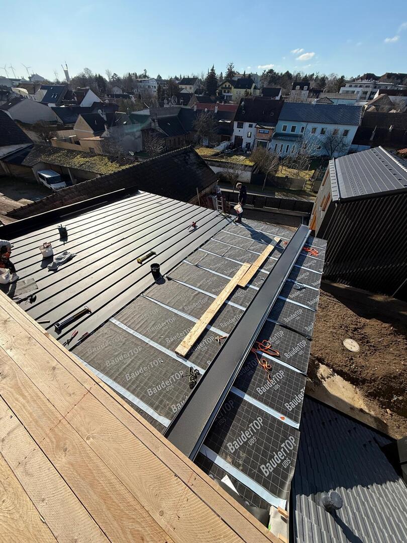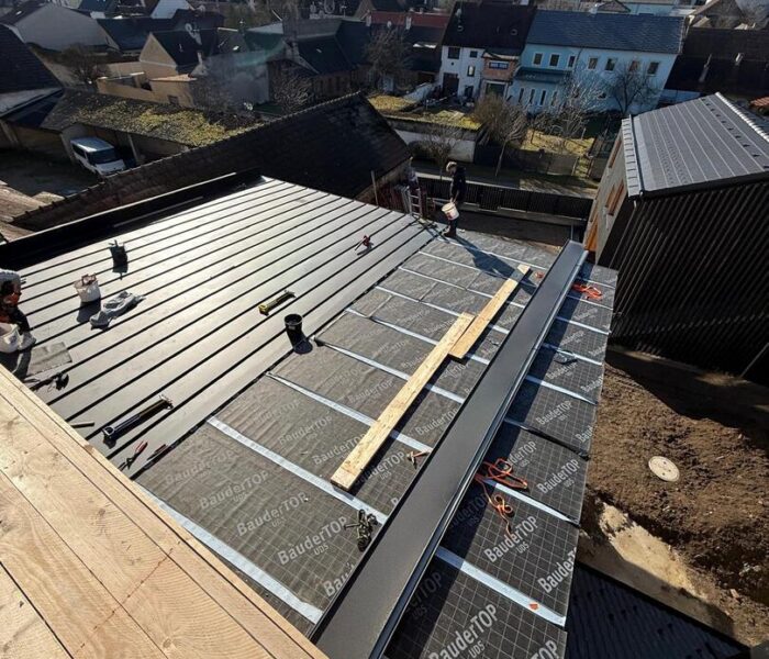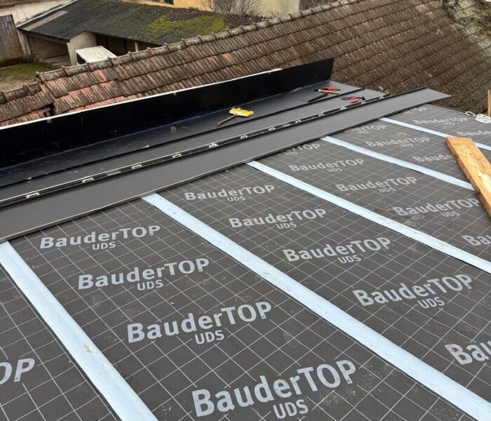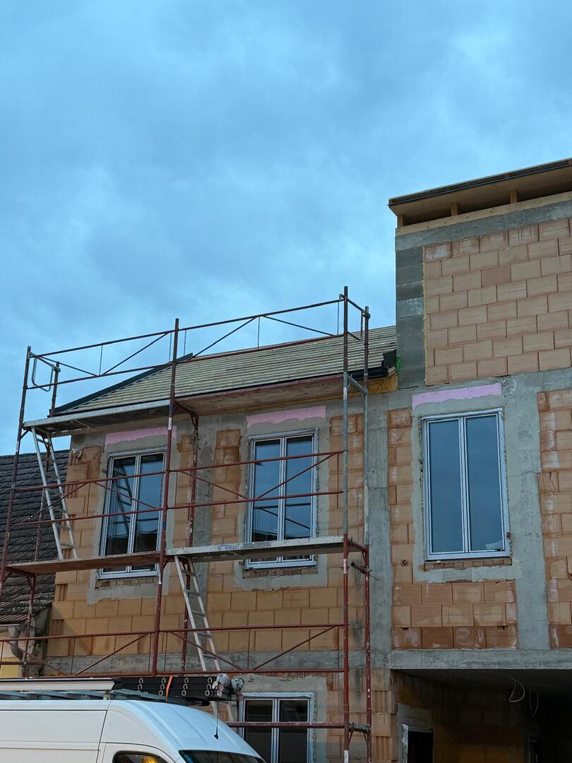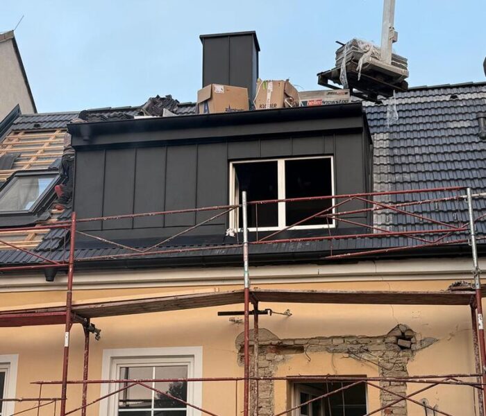 Bei diesem Projekt wurde das Obergeschoss eines Wohnhauses modernisiert und das Dach komplett neu gedeckt. Zunächst entstand der Rohbau in Ziegelbauweise, danach wurden Dachgauben montiert, um mehr Licht und Raum zu schaffen. Anschließend erfolgte die Eindeckung mit hochwertigen Metallplatten, unterstützt durch eine stabile Holzunterkonstruktion und Abdichtung mit BauderTOP-Schutzfolie.