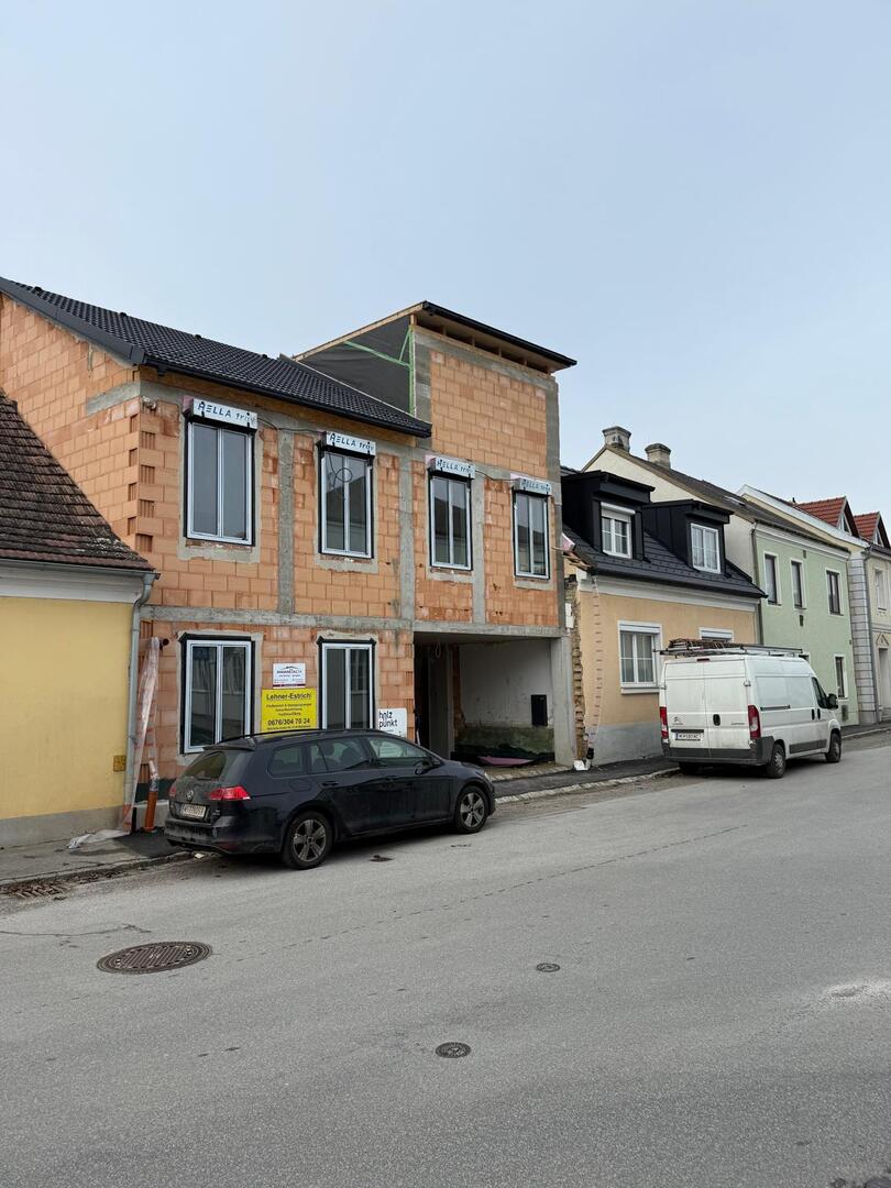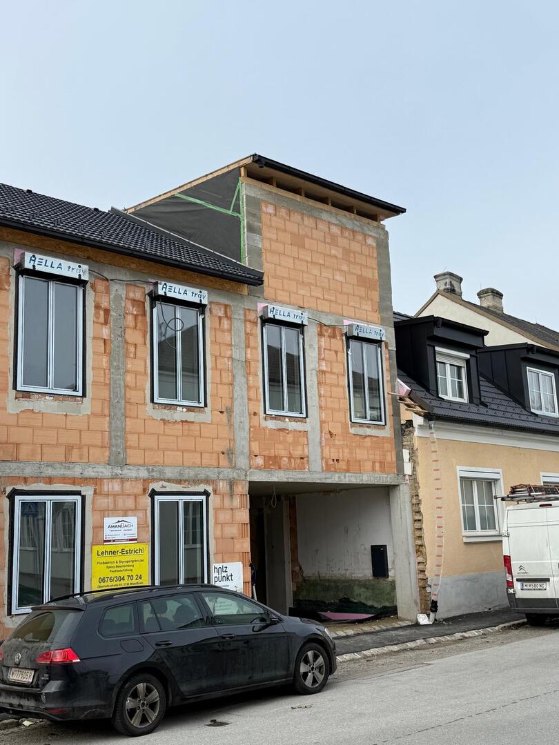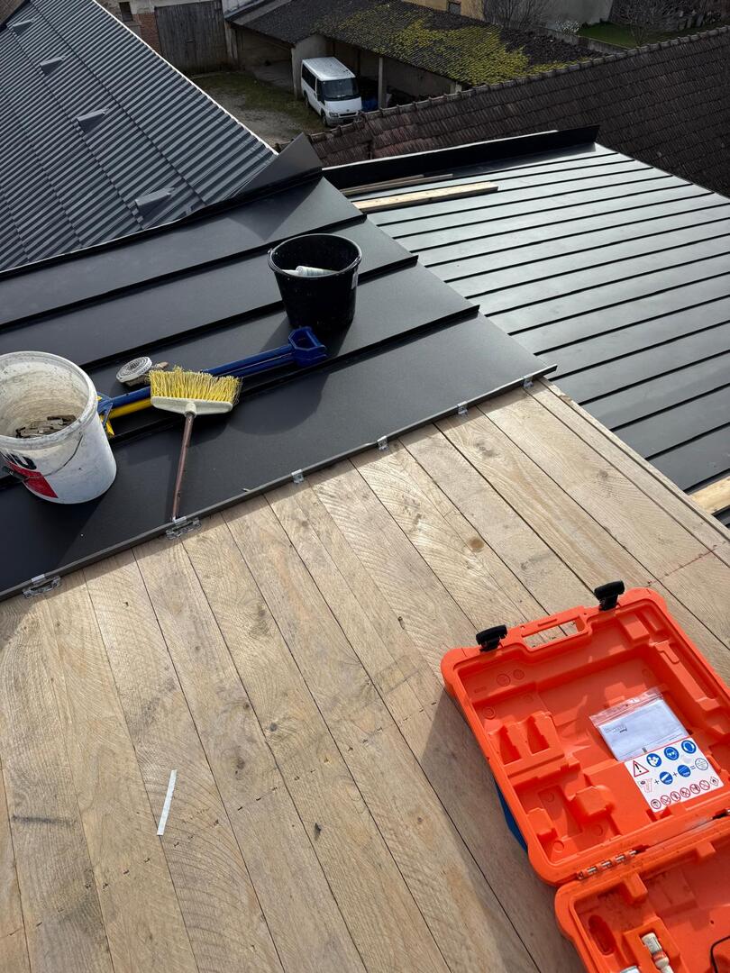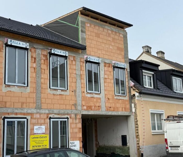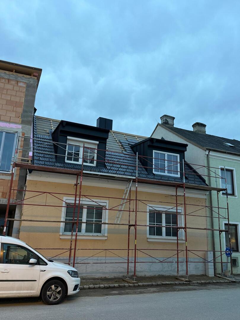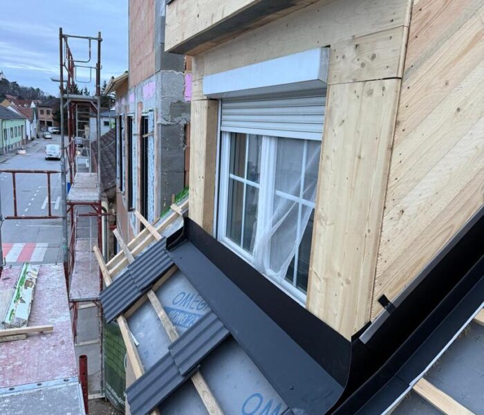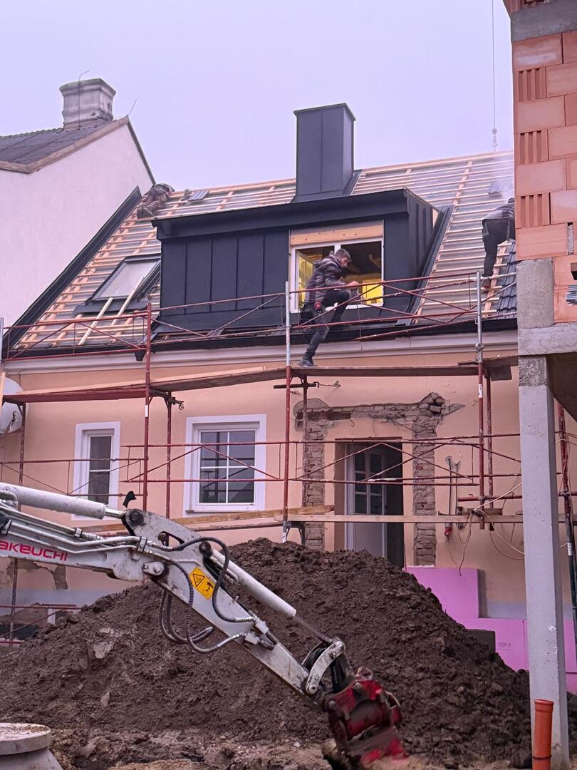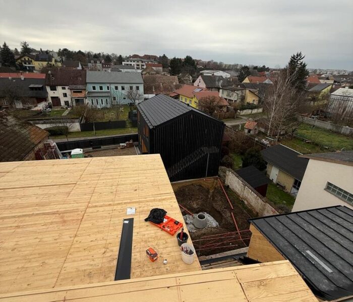 Bei diesem Projekt wurde das Obergeschoss eines Wohnhauses modernisiert und das Dach komplett neu gedeckt. Zunächst entstand der Rohbau in Ziegelbauweise, danach wurden Dachgauben montiert, um mehr Licht und Raum zu schaffen. Anschließend erfolgte die Eindeckung mit hochwertigen Metallplatten, unterstützt durch eine stabile Holzunterkonstruktion und Abdichtung mit BauderTOP-Schutzfolie.